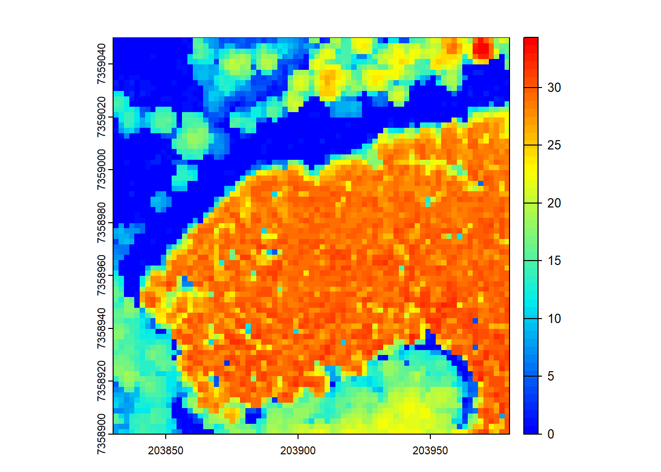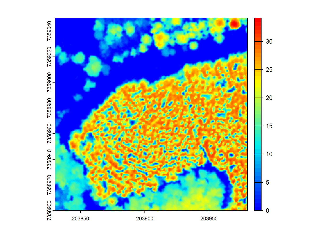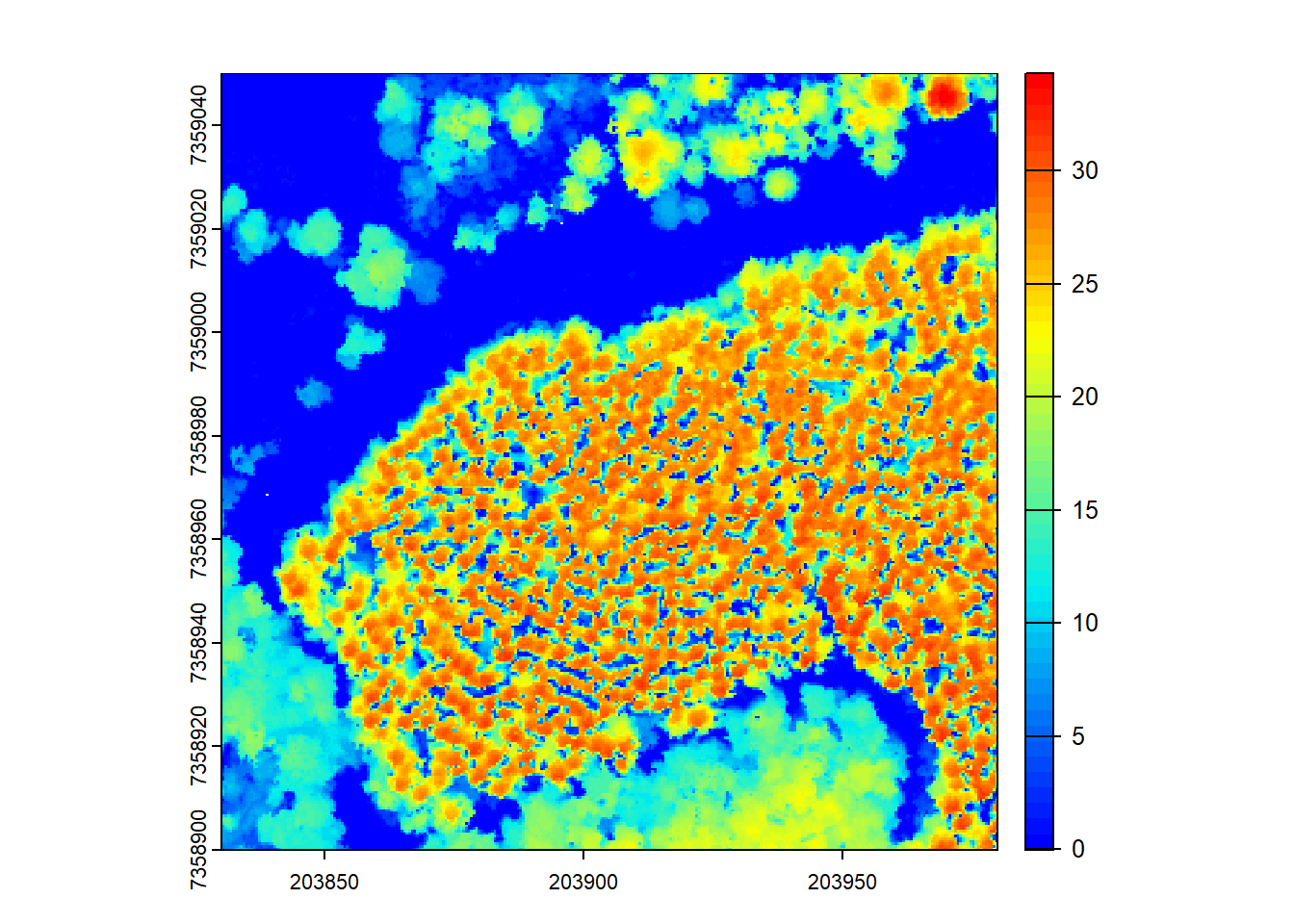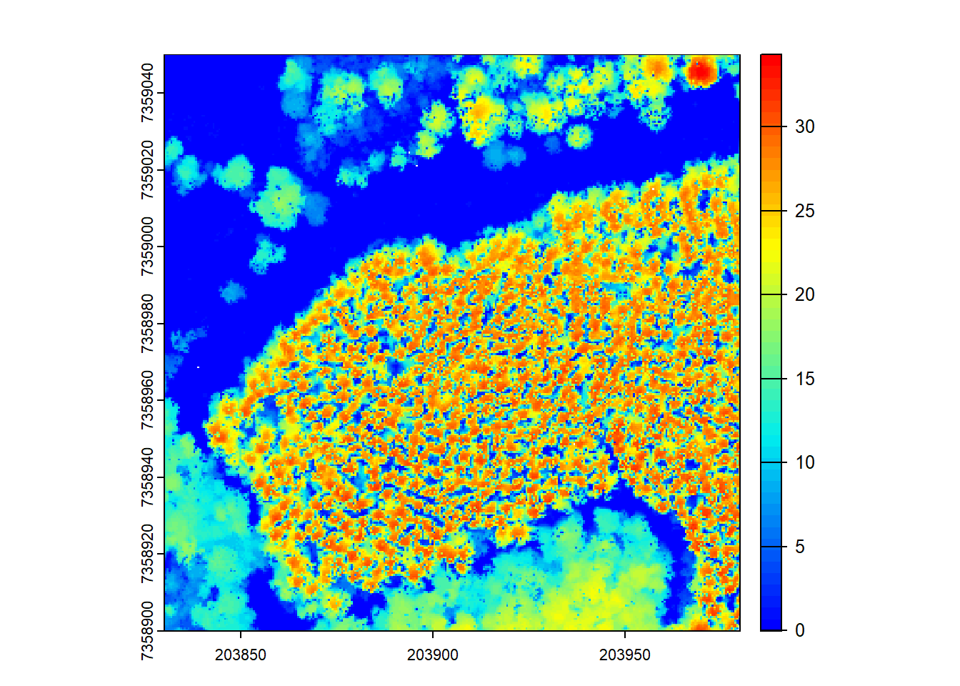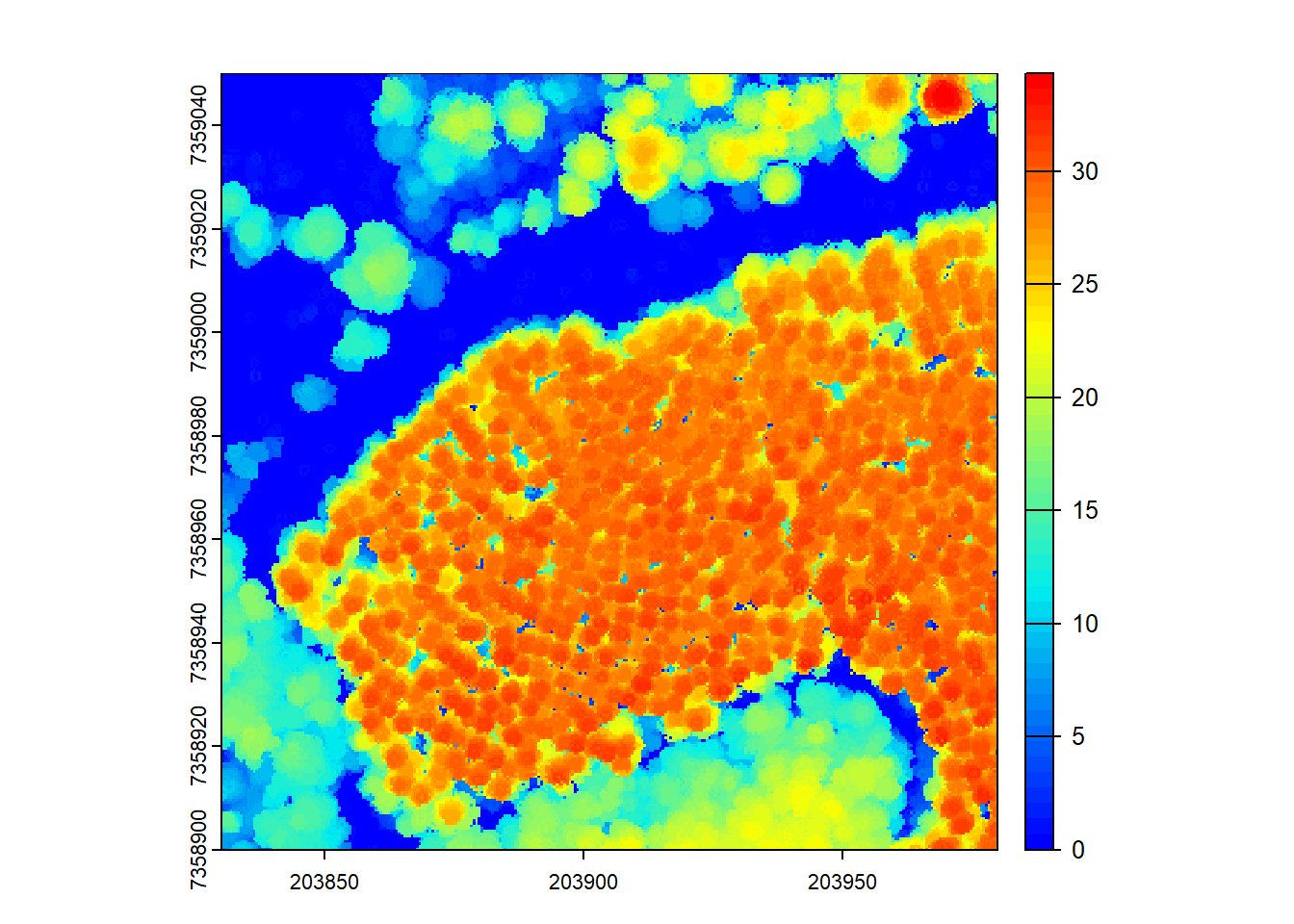 chm <- rasterize_canopy(las = las, res = 2, algorithm = p2r())